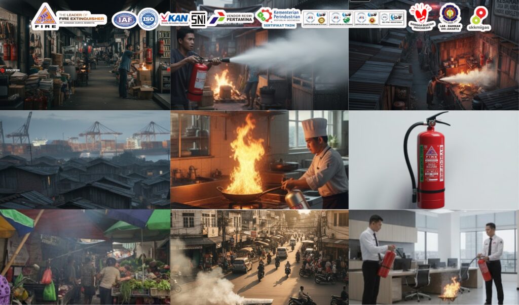 • Dampak Potensial: Kebakaran di pasar biasanya terjadi cepat dan merata. APAR, khususnya jenis Dry Chemical Powder (DCP) atau Carbon Dioxide (CO₂), wajib tersedia di setiap kios atau zona pasar untuk memutus rantai api pada detik-detik pertama.