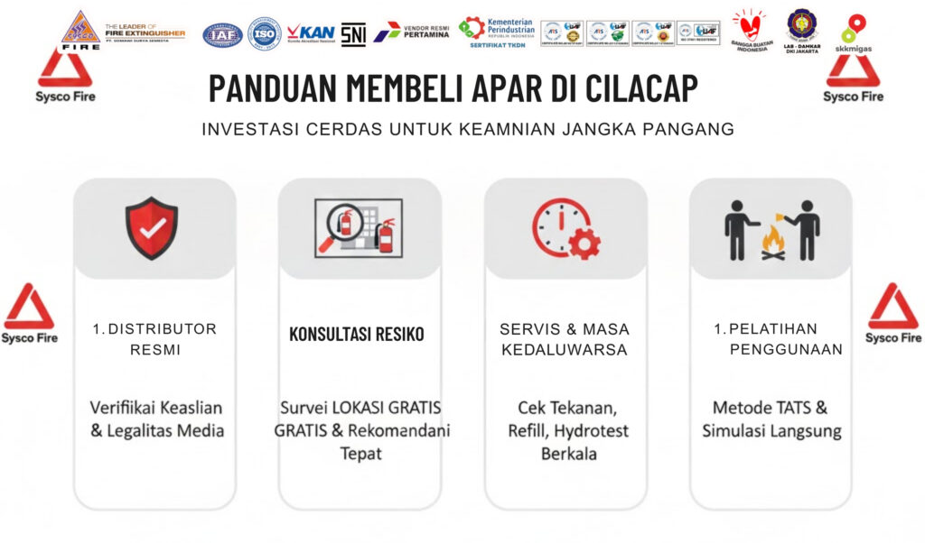 Dengan berinvestasi pada APAR yang tepat dari Sysco Fire, Anda bukan hanya mematuhi peraturan pemerintah, tetapi Anda sedang membangun benteng pertahanan pertama yang andal bagi diri Anda, keluarga, dan karyawan. Jadilah bagian dari warga Cilacap yang cerdas dan proaktif dalam menjaga keselamatan.