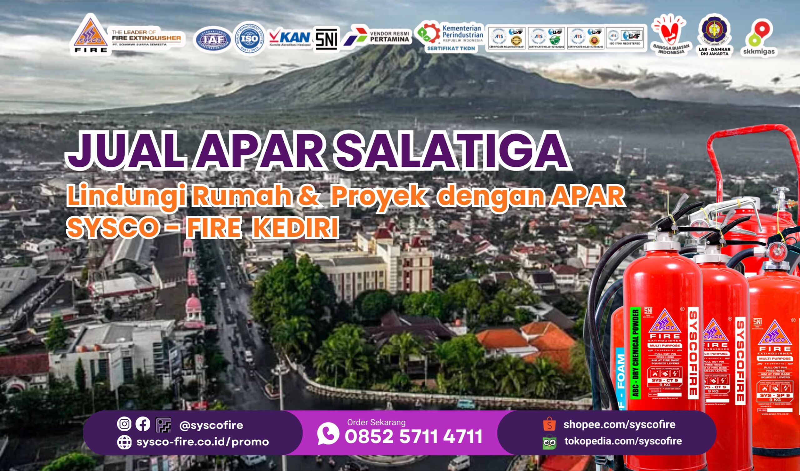 Kami Sysco Fire Kediri melayani pengiriman dan instalasi APAR ke seluruh Indonesia, termasuk Salatiga, dengan harga distributor.