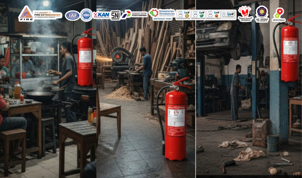 - Rumah Makan dan Depot Kuliner Ngawi: Dapur dengan risiko minyak panas (Kelas F) dan kompor gas (Kelas B) adalah zona risiko tinggi. APAR yang tepat sangat penting.