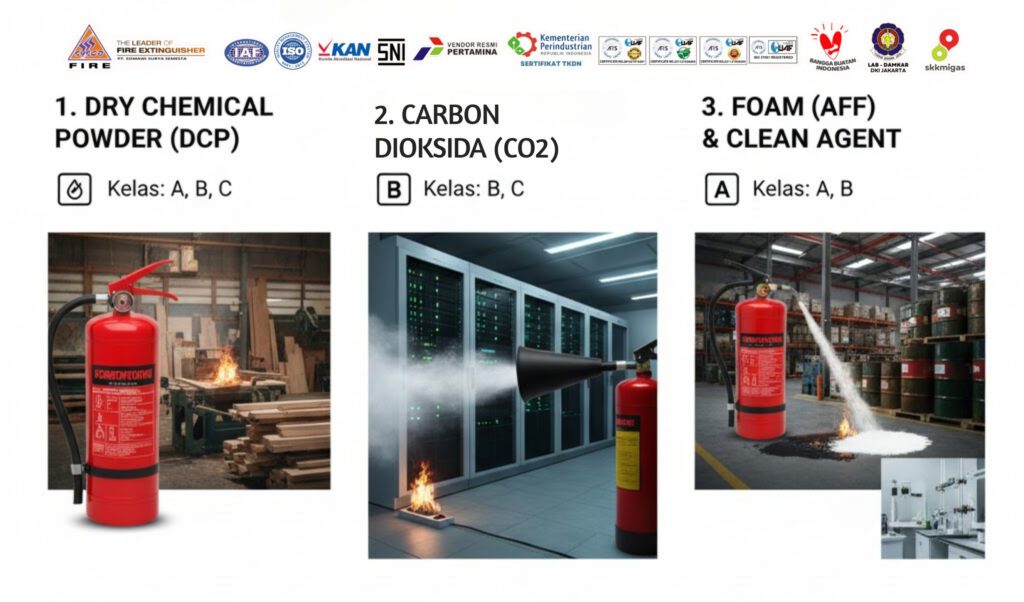 - Foam (Busa): Kelas A dan B. Cocok untuk area penyimpanan cairan mudah terbakar skala besar.